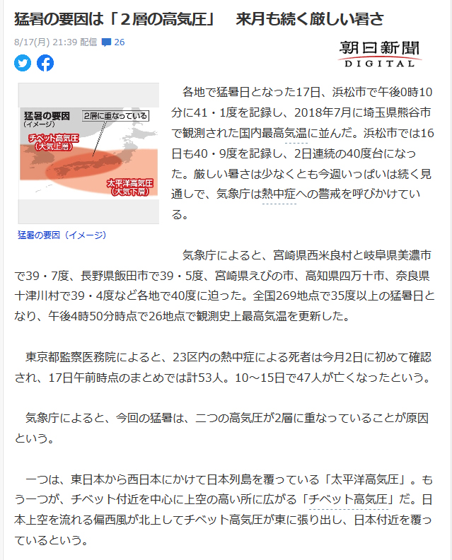 17日は静岡県浜松市でこれまでの国内の最高気温に並ぶ41.1度を観測するなど各地で記録的な暑さとなりました。18日も西日本を中心に、40度に迫る危険な暑さとなる見込みで、引き続き、熱中症に厳重に警戒してください。